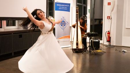 Musikalisch erlebten die rund 100 Gäste aus Politik, Wirtschaft, Verwaltung und Zivilgesellschaft eine außergewöhnliche Live-Improvisation von Harfenistin Zainab Lax an der Loop-Station und Tänzerin Janan Almasi, die mit Contemporary Persian Dance beeindruckte.